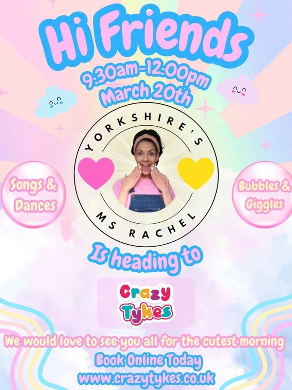 Yorkshire's Ms Rachel is coming to Crazy Tykes on March 20th from 9.30 am to 12.00 pm for the most magical little morning! 🌟The cutest morning awaits 🧸✨